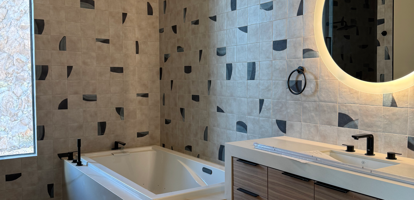 These porcelain slabs were used to wrap the entire master bathroom. This material book matched perfectly around every corner and on every over sized wall.